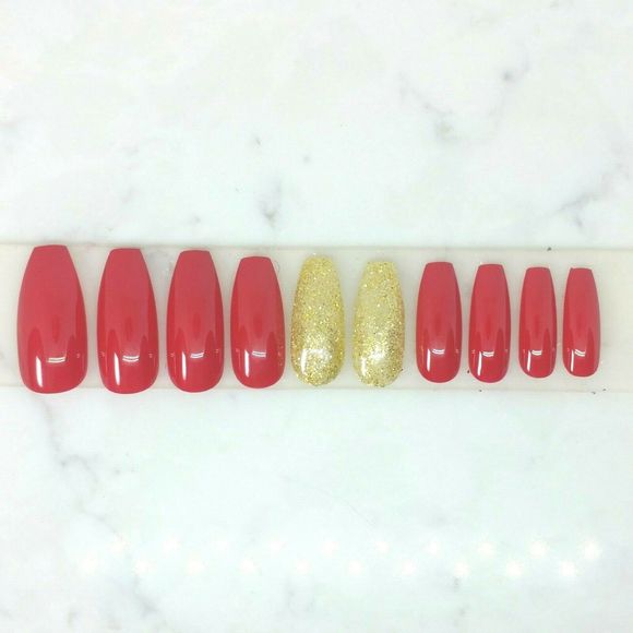 Handmade Makeup Custom Press On Nails Long Red Coffin Gold Glitter Poshmark