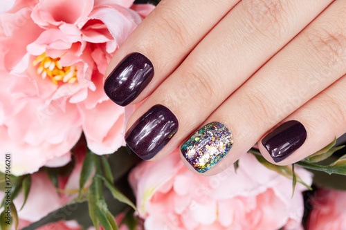 Hand With Manicured Nails Colored With Dark Purple Nail Polish And Pink Peony Flower Stock Photo Adobe Stock